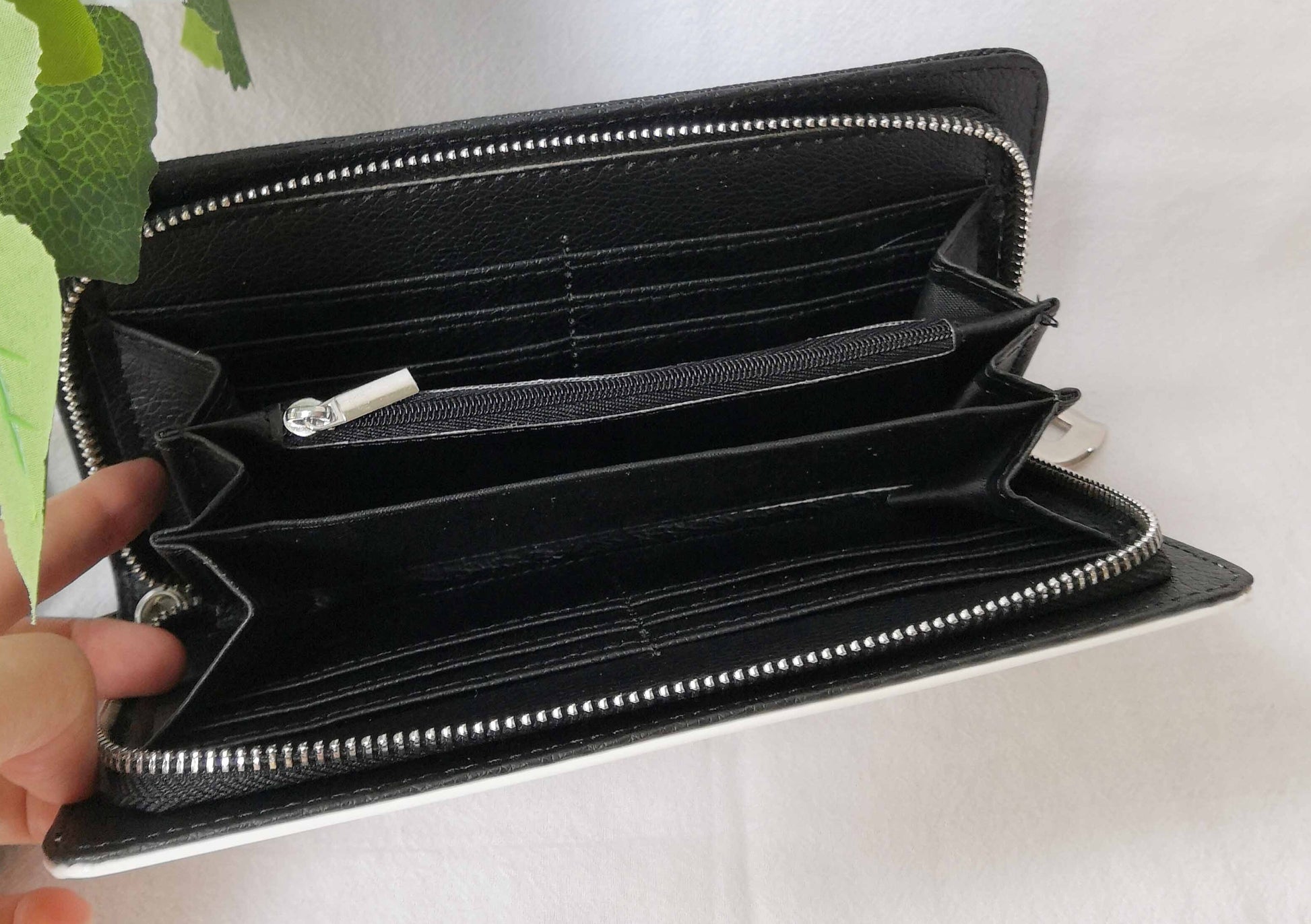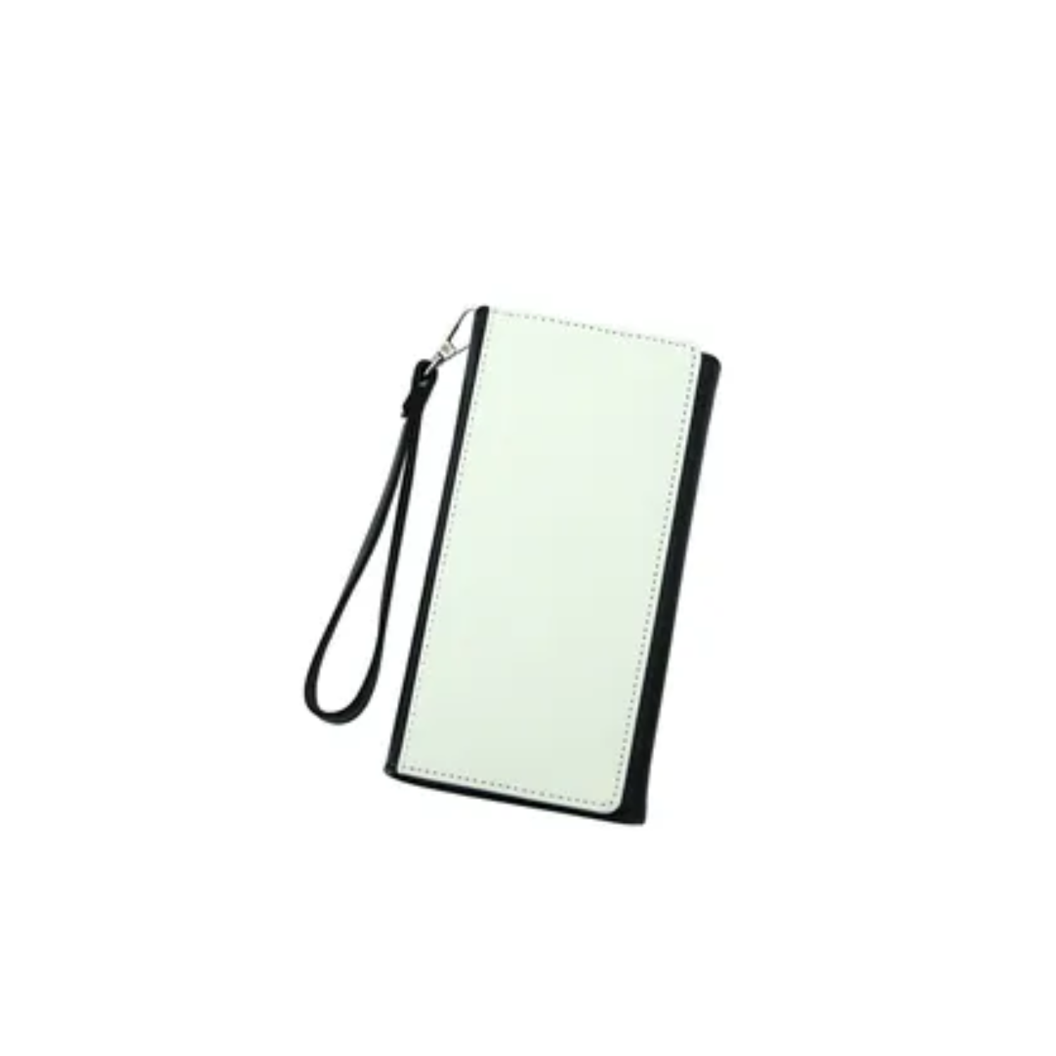 This wallet is made of black faux leather and features a white fabric front for sublimation, two snap locks, multiple storage slots, check book insert, zippered coin pouch, and a bill slot.